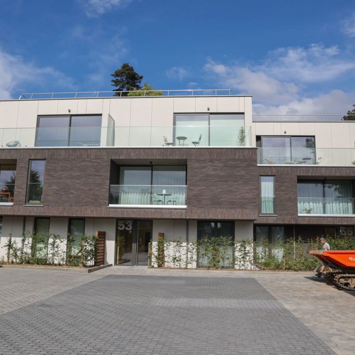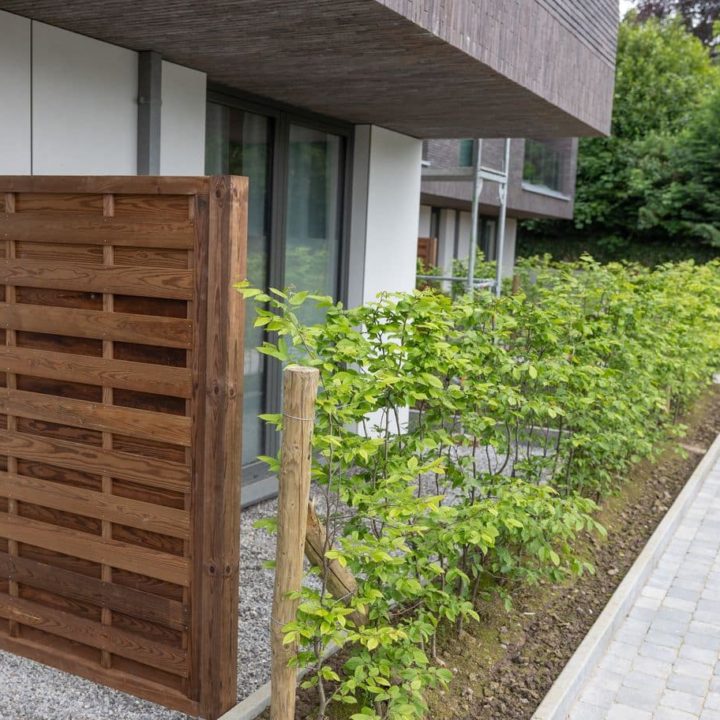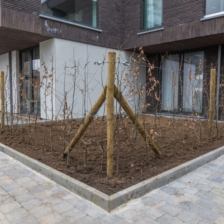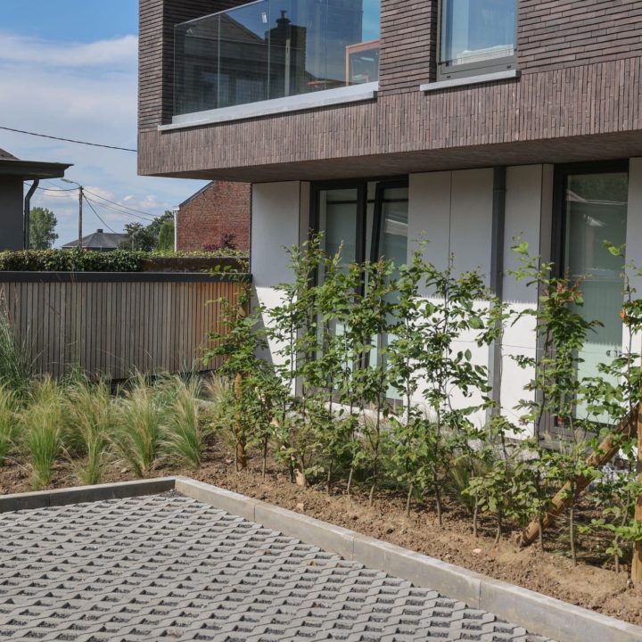 Aménagement des abords d’un immeuble contemporain comptant 12 logements sur 3 niveaux à l’ombre d’arbres remarquables.