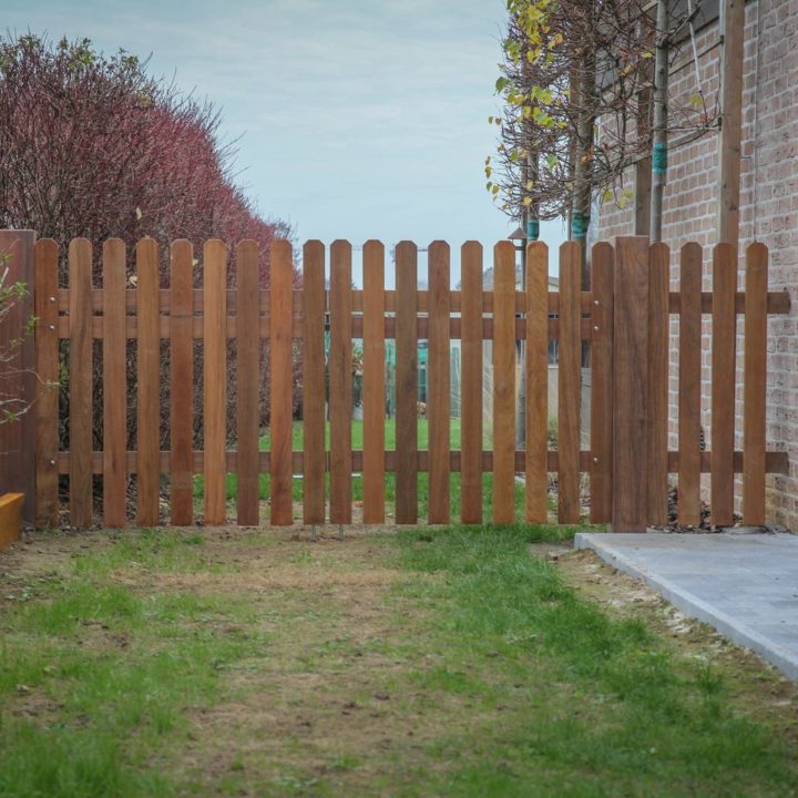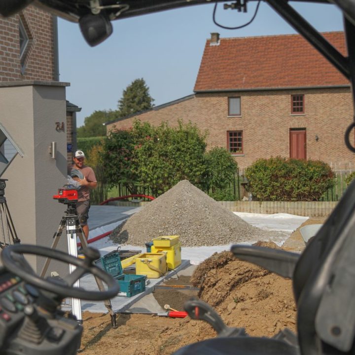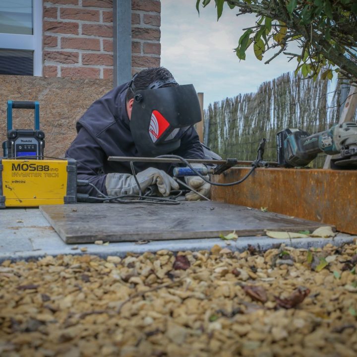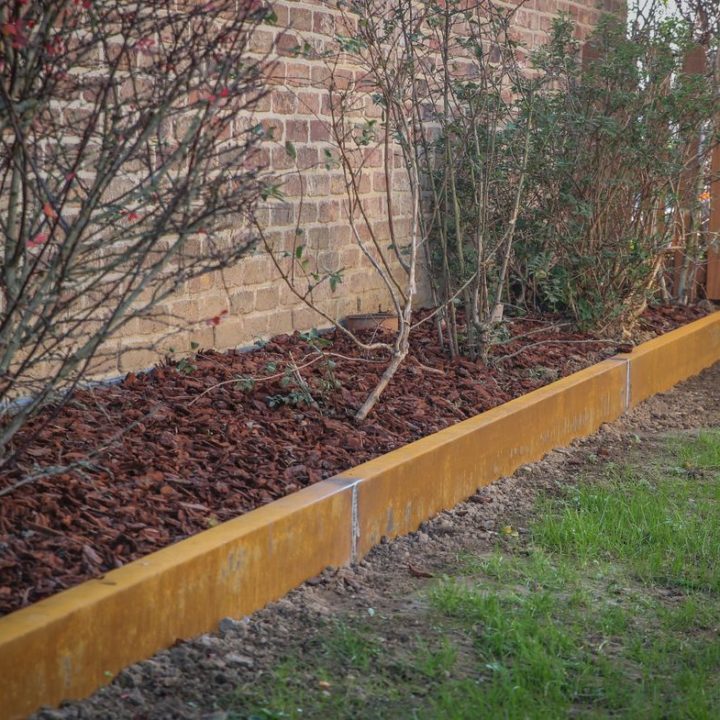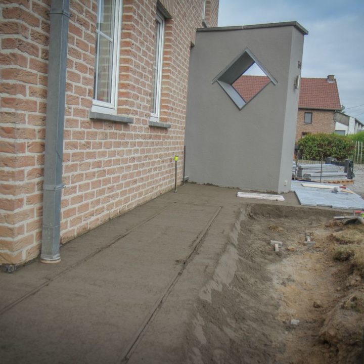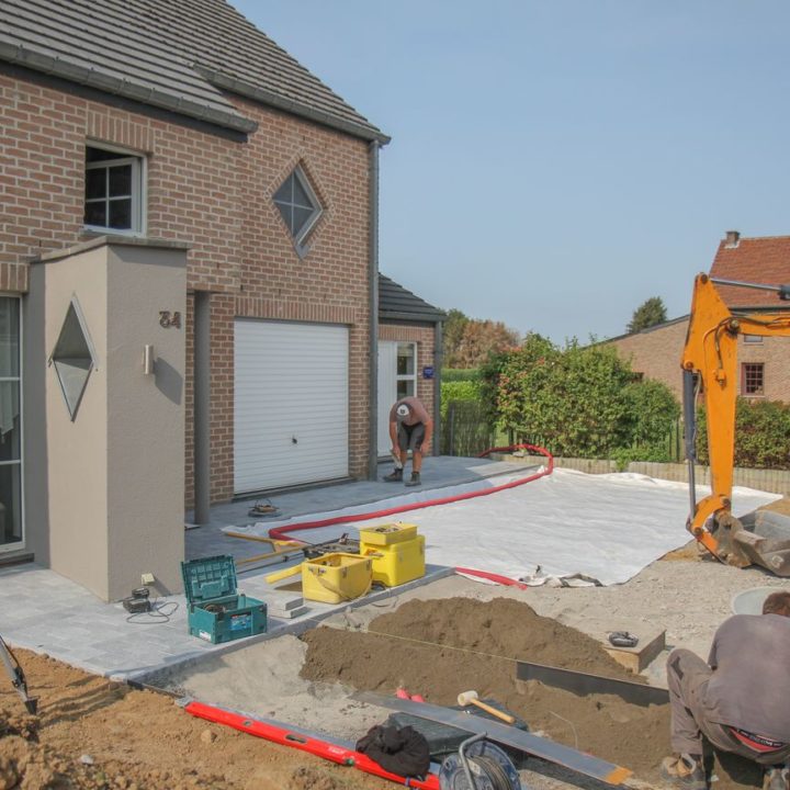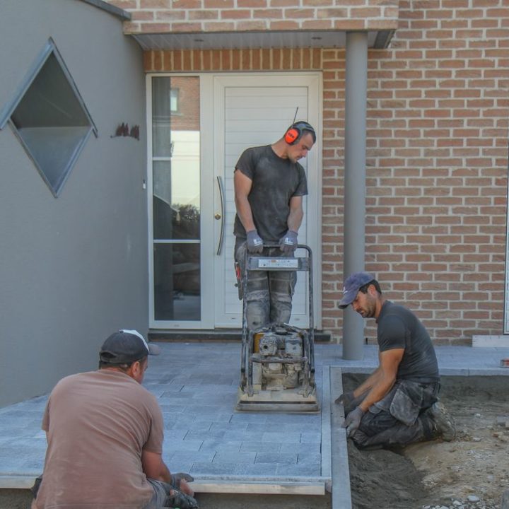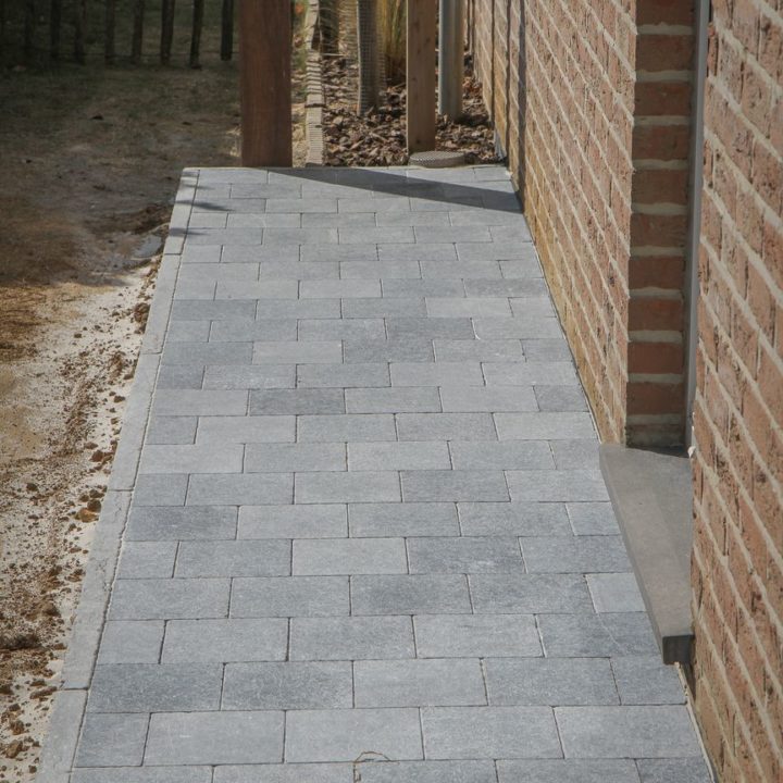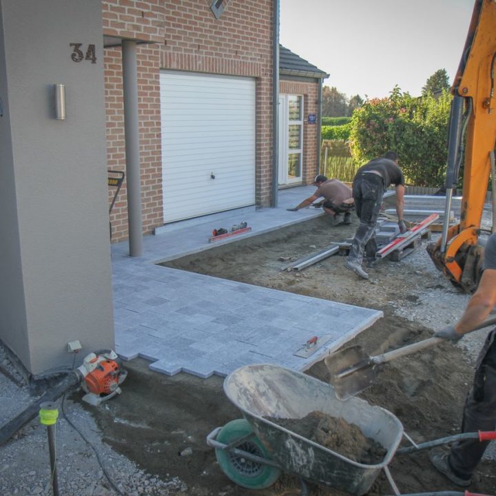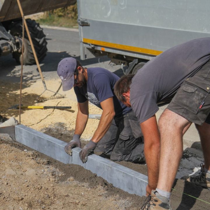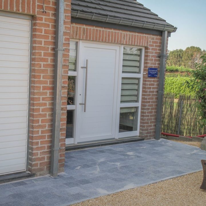 Réalisation de trottoirs en pierre bleue, chemin d’accès, barrière en bois, bac à plantation, habillage de murets en acier corten, terrassement et parking .