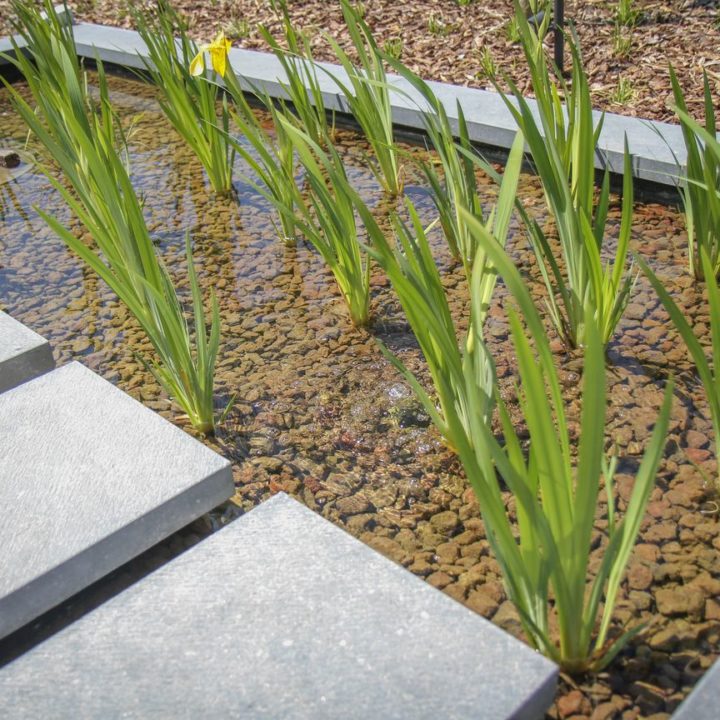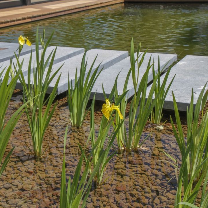 Cette pièce d’eau est réalisée avec un système de filtration écologique par lagunage.