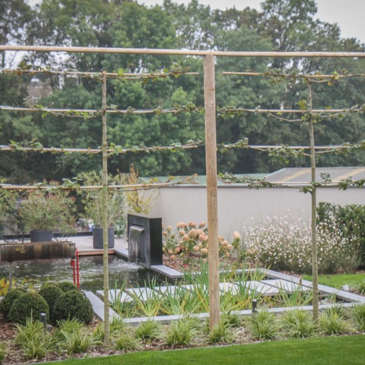 Des tilleuls palissés forment un écran qui cachent la vue de la rue.