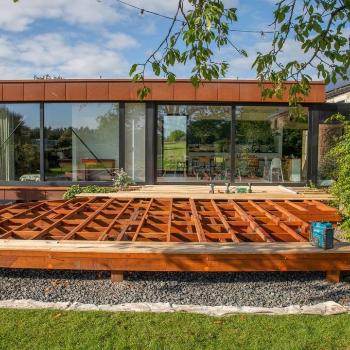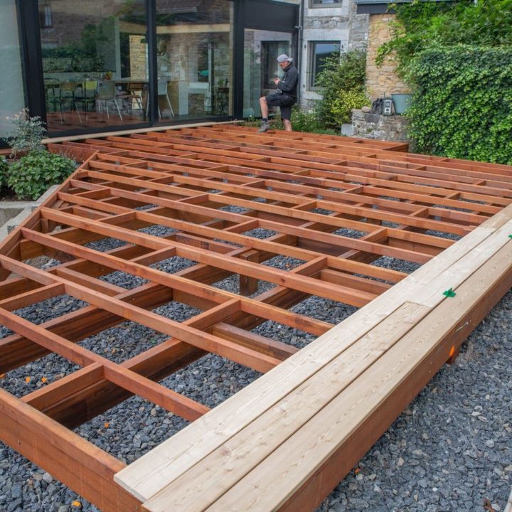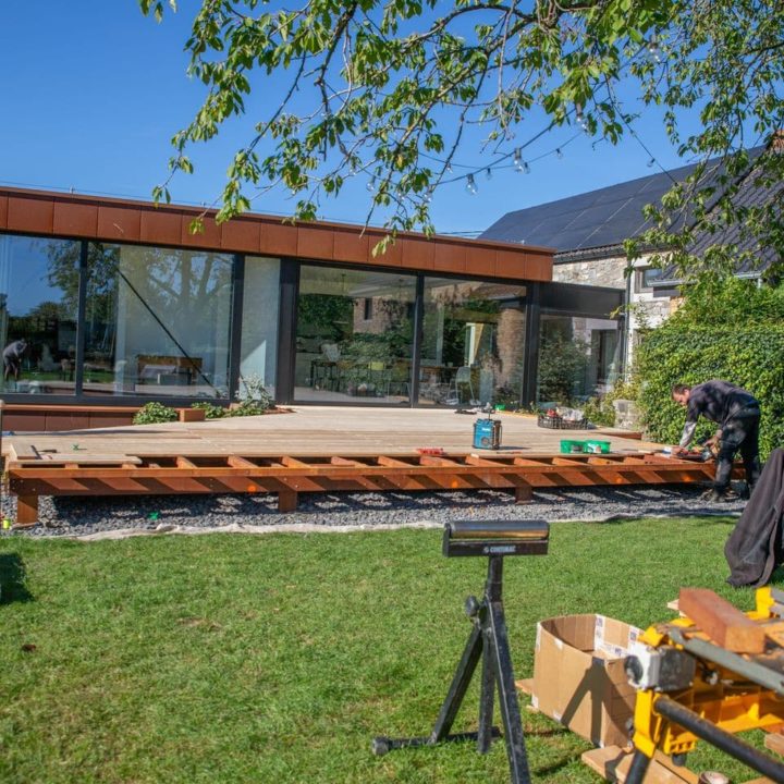 Aménagement d’une terrasse en mélèze et d’un coin repas en briques verticales