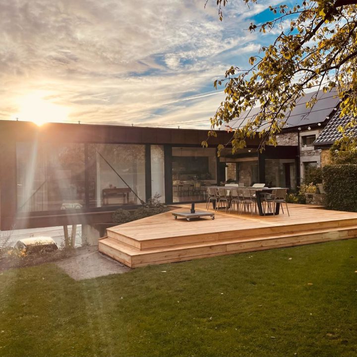 Dans ce petit hameau condruzien, les propriétaires d’une habitation en pierre du pays, ont créé une extension en bois, recouverte d’acier Corten.