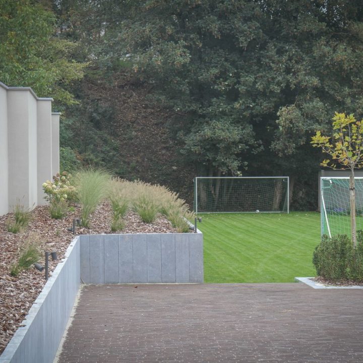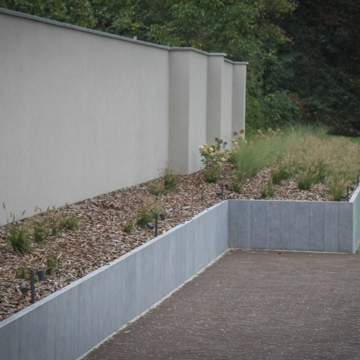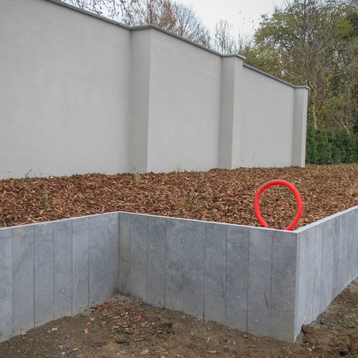 Pour retenir les terres d’un talus et d’un jardin en pente, nous avons posé des pilasses en pierre bleue sur l’avant du jardin et des L en béton, sur la partie arrière.