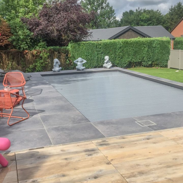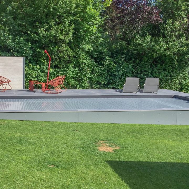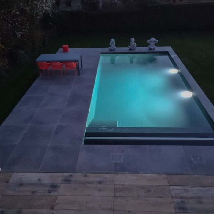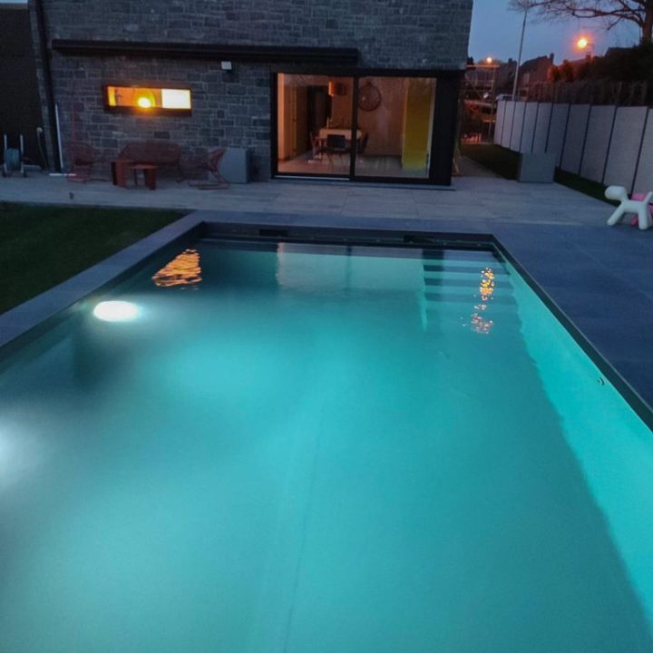 Réalisée en stepocs et équipée d’ un volet déroulant, cette piscine est chauffée par une pompe à chaleur fonctionnant grâce aux panneaux photovoltaïques.