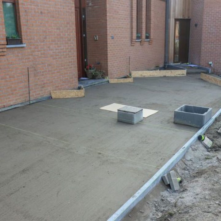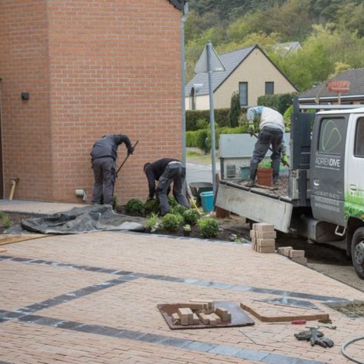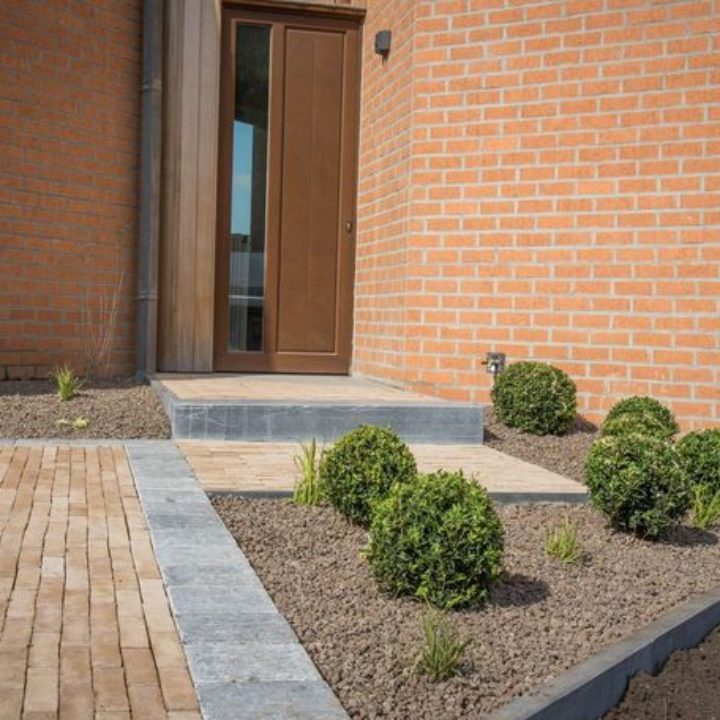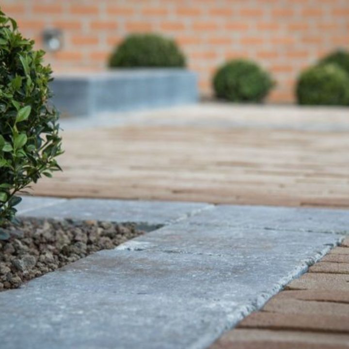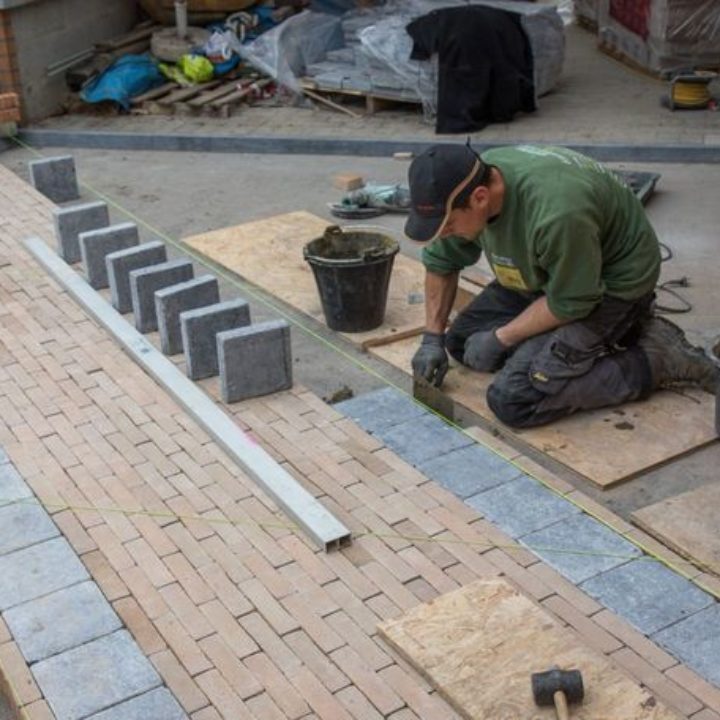 Utilisation de pavés en pierre bleue du Hainaut, et briques en terre cuite.