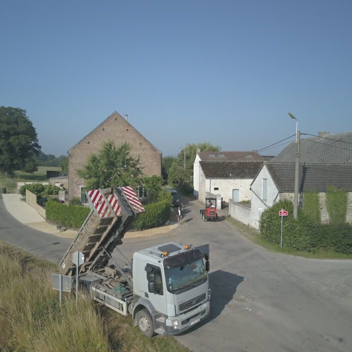 Extension d’une cour intérieure par la pose de briques sur chant et de pavés en pierre bleue.