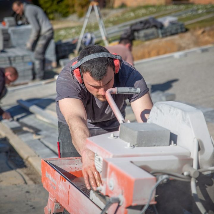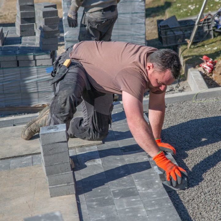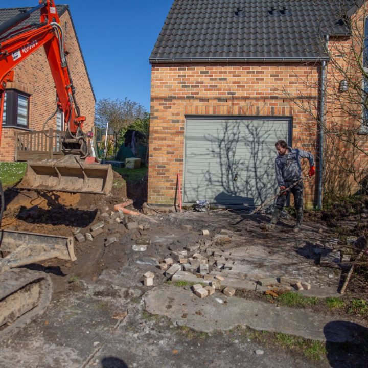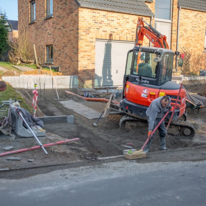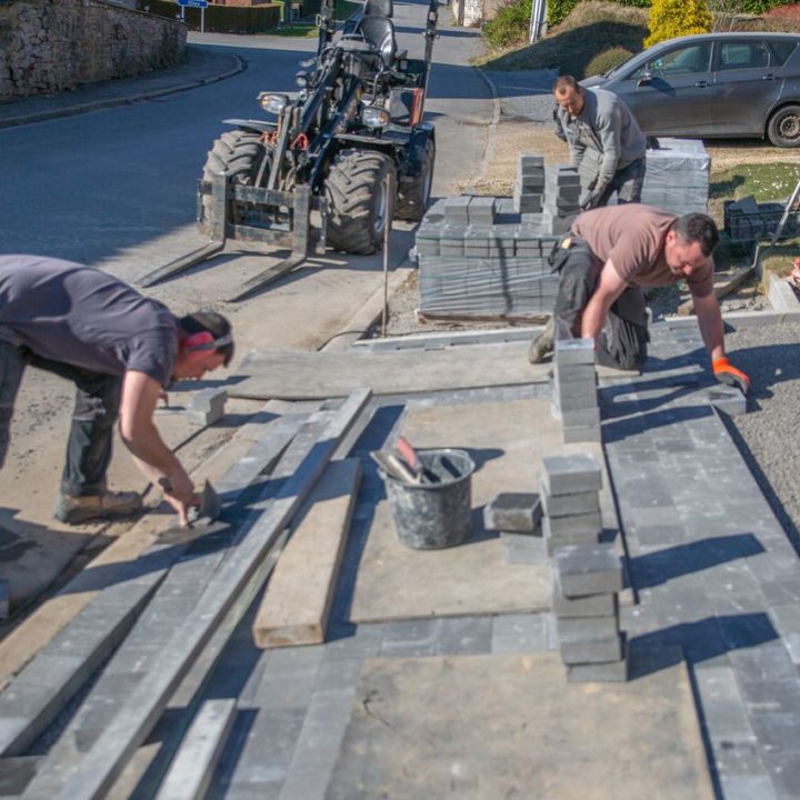 Aménagement de la devanture d’une maison de village. Pose de bordures, d’escaliers, de « L » et de pavés en béton .