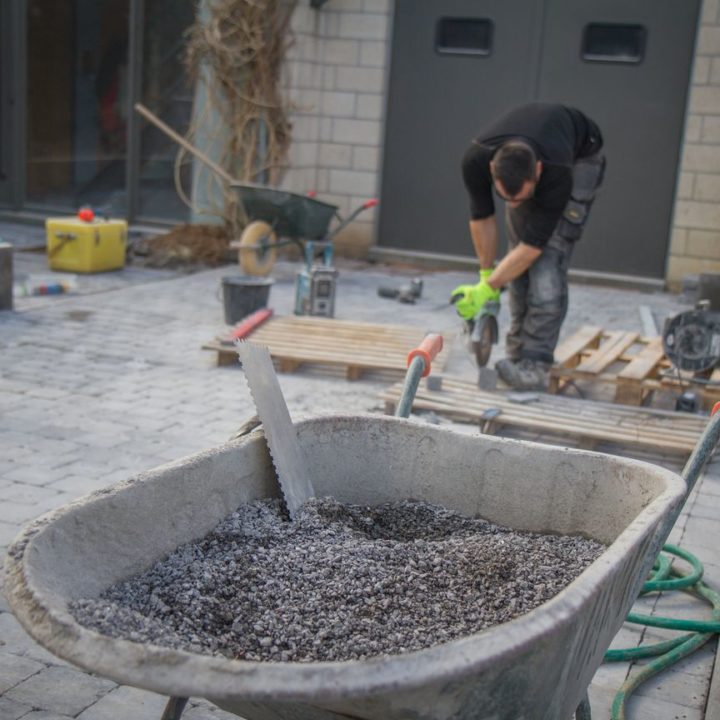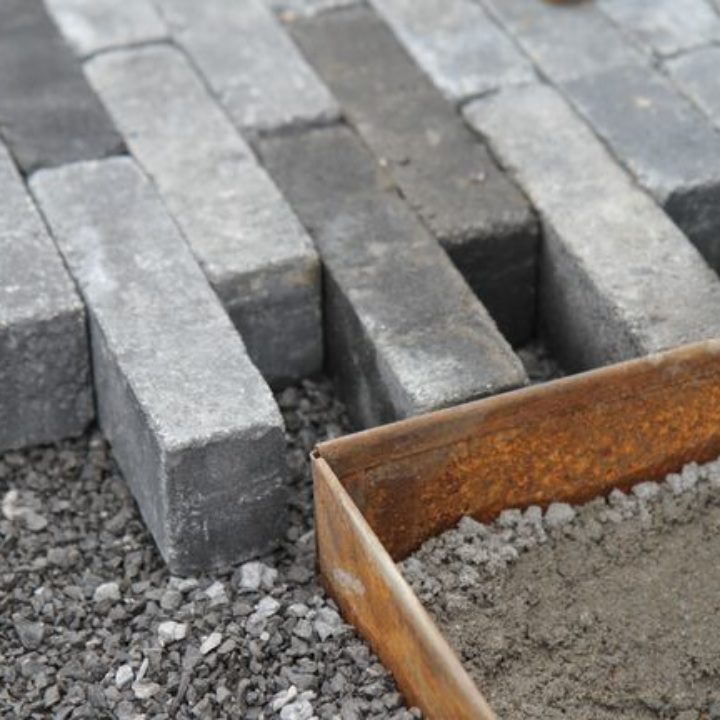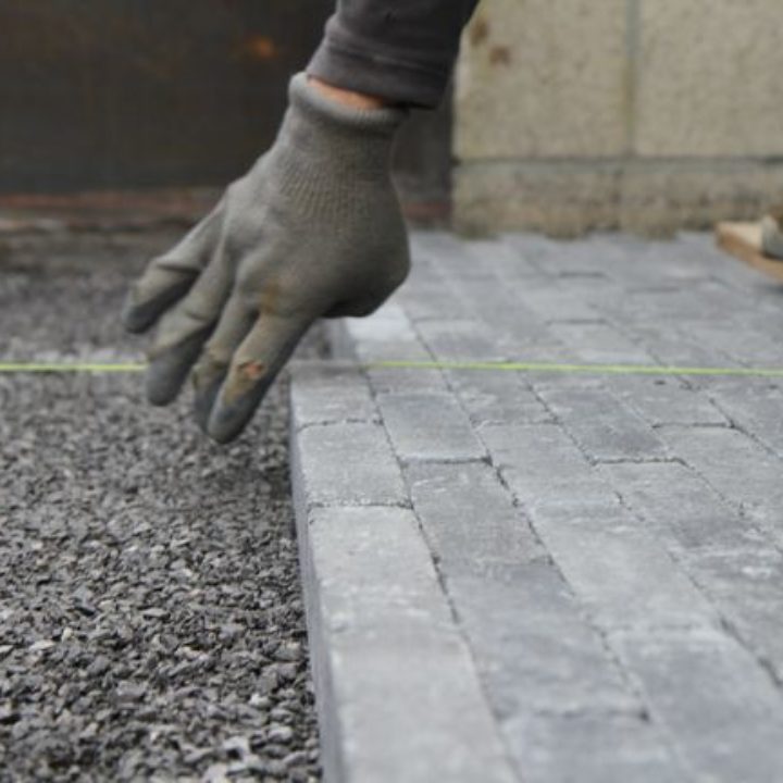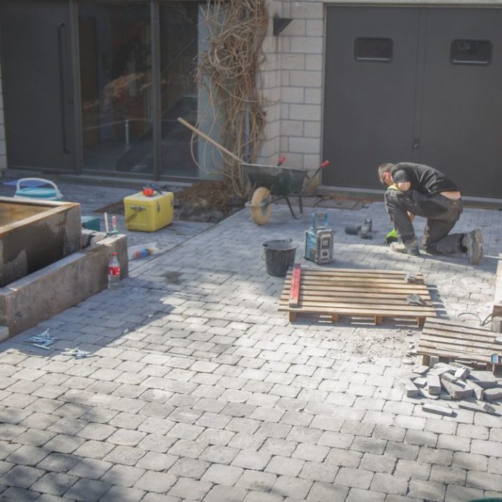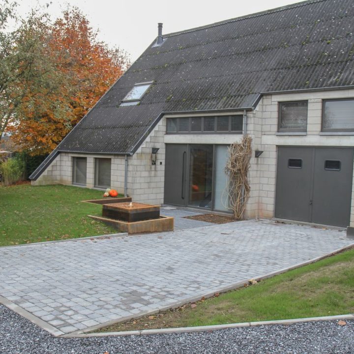 Rénovation de l’égouttage, pose de bordure et de klinkers. Intégration de taques à paver. Refection pelouse.