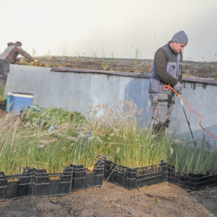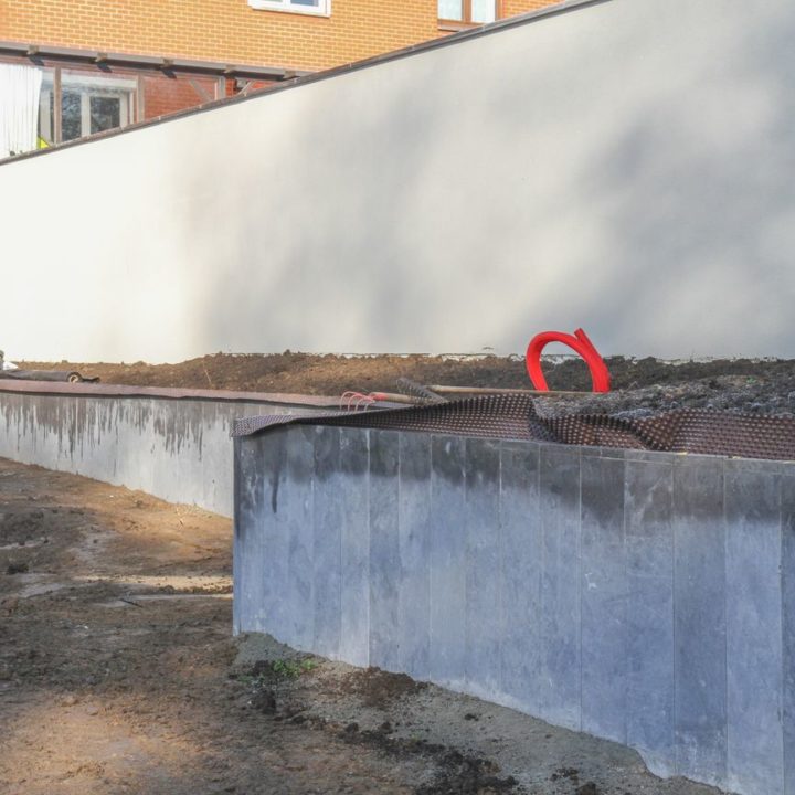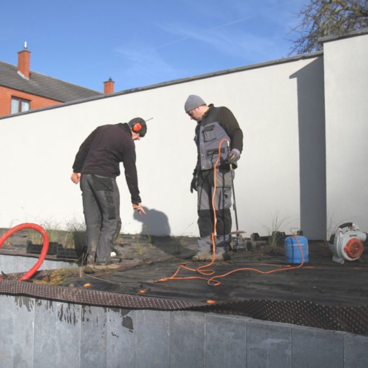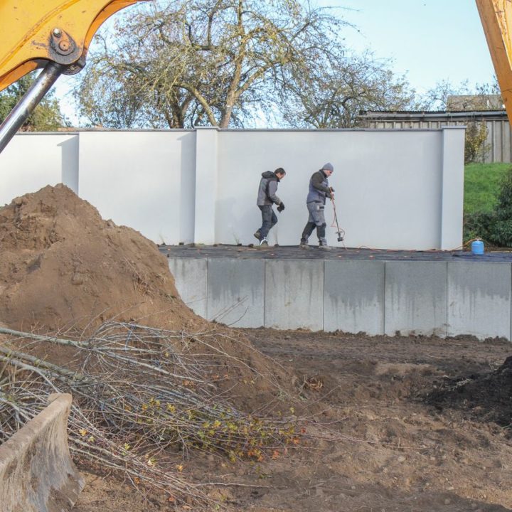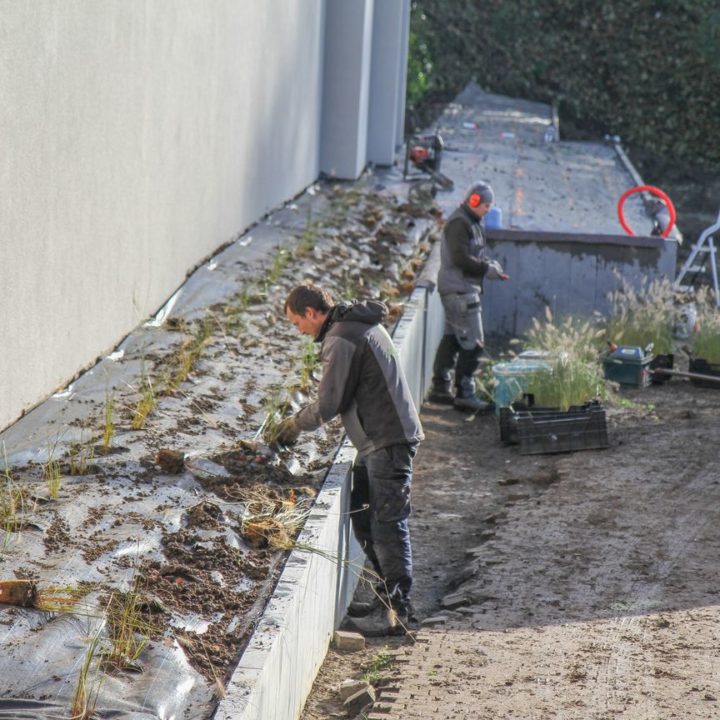 Après avoir réalisé des retenues de terre à l’aide de L en béton et de pierre bleue, voici le moment de planter. Nous avons choisi des graminées ( Miscantus) pour donner du volume, ainsi que des lierres (Hedera) qui retomberont sur les murs . Pour délimiter le jardin du voisin, ce sont de petits arbres ( prunus lusitanica) qui ont été plantés.