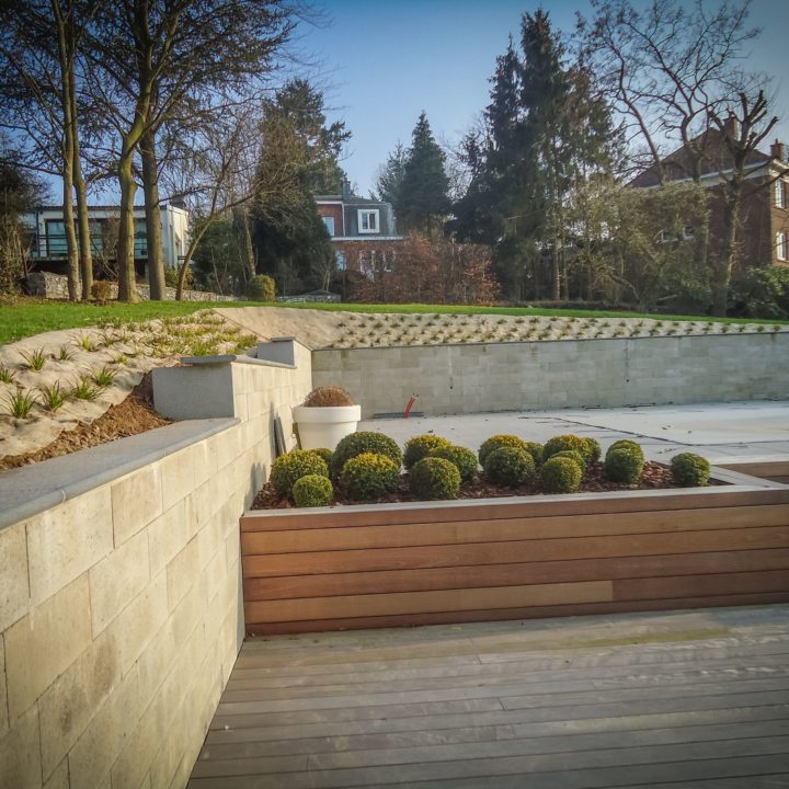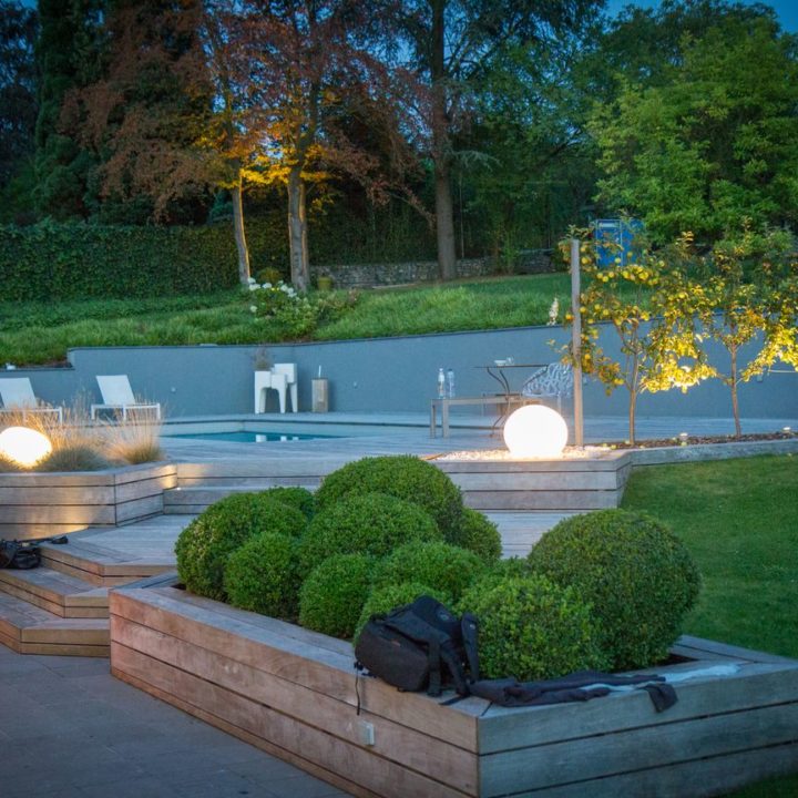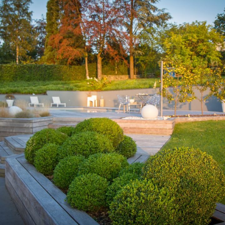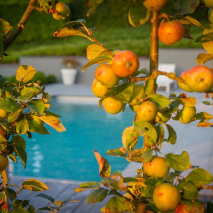 Plantations autour d’une piscine #piscine Plantations autour d’une piscine avec des boules de buis, des graminées et des arbres fruitiers palissés. Partager