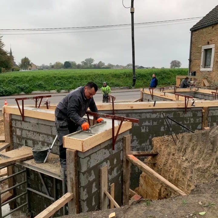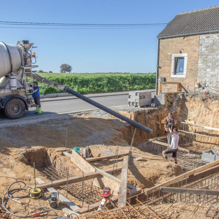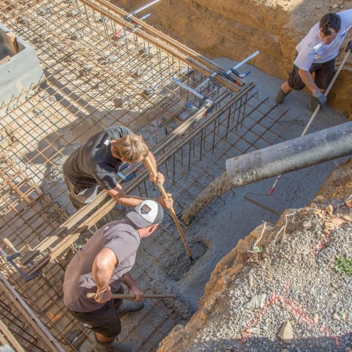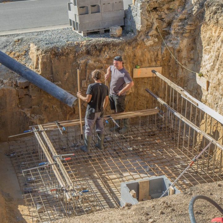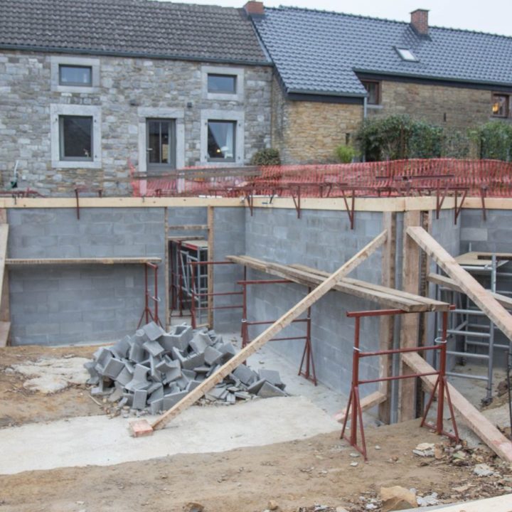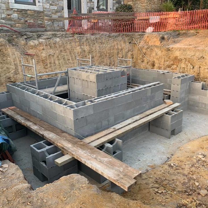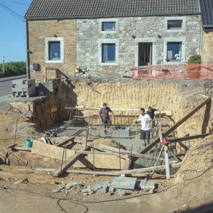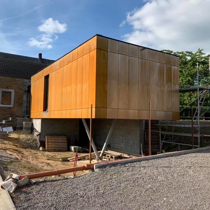 Terrassements en vue de la réalisation de fondations, caves et parking sous une maison en bois, recouverte d’acier Corten.