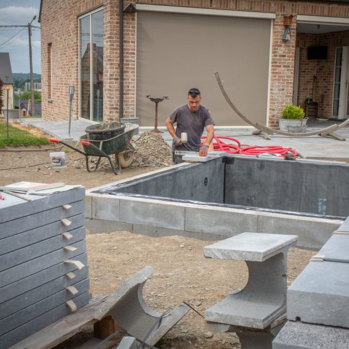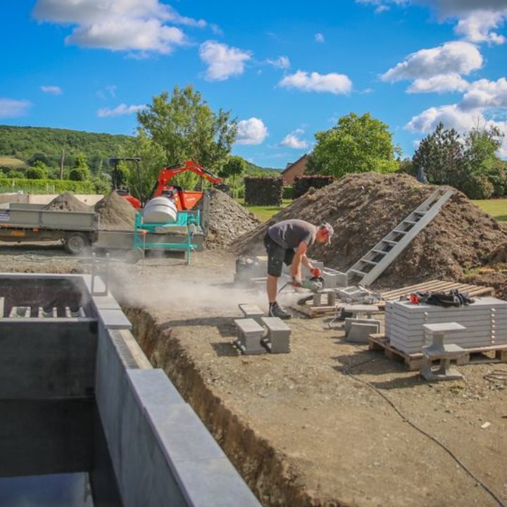 Situé à la frontière française, cet étang de baignade est réalisé en béton armé, coulé d’une pièce, puis recouvert d’un feutre et d’une bâche en EPDM . La zone de lagunage permet une filtration naturelle du bassin. Une terrasse en bois, des plantations et une nouvelle pelouse agrémentent les lieux.