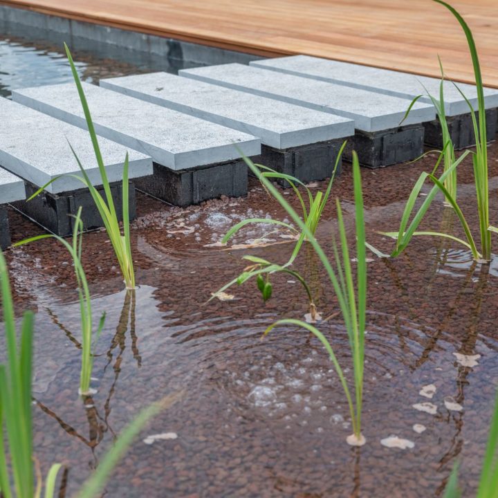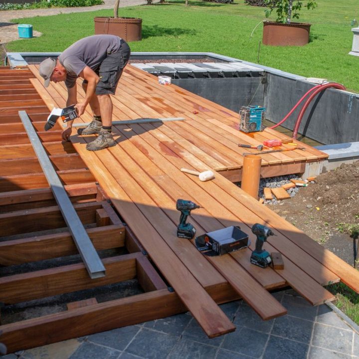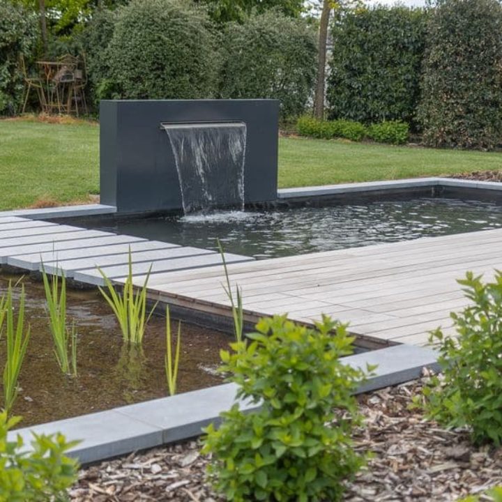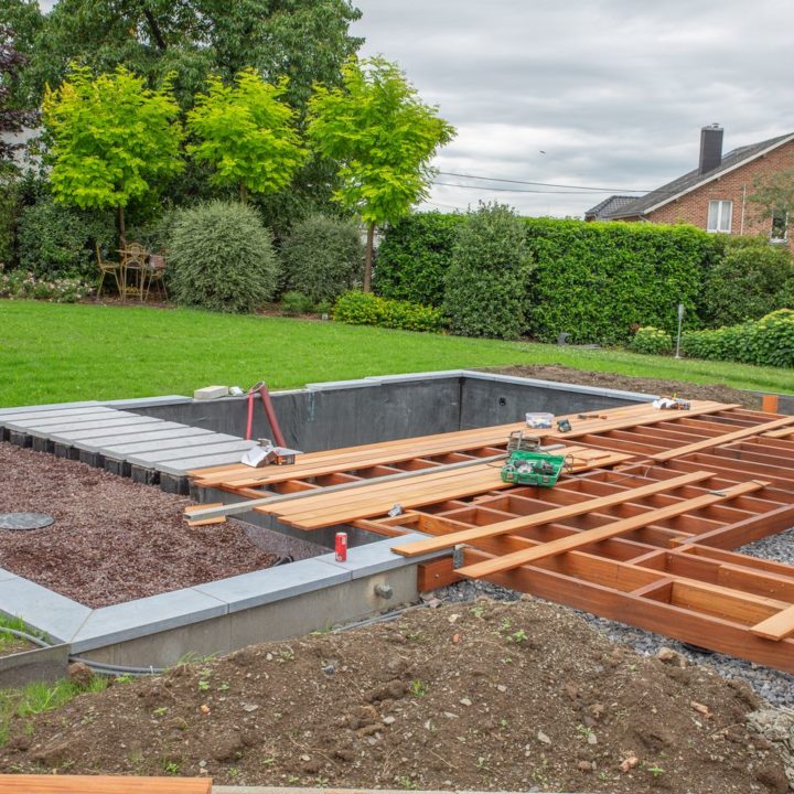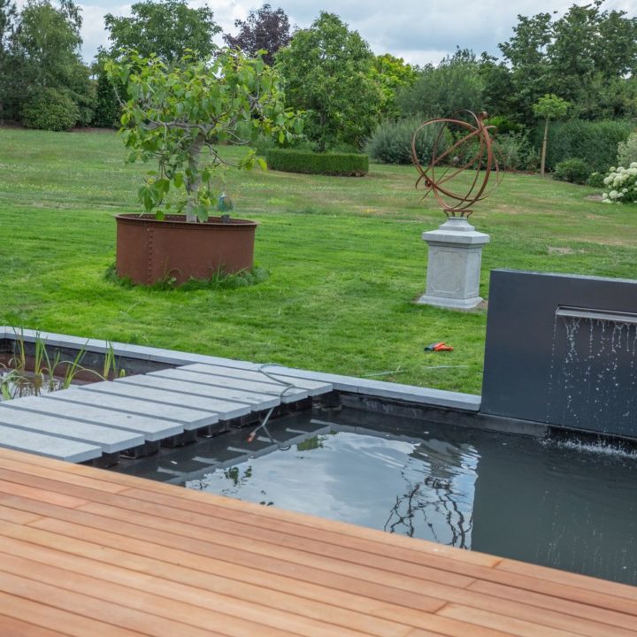 Réalisation d’un étang de baignade écologique et terrasse en bois.
