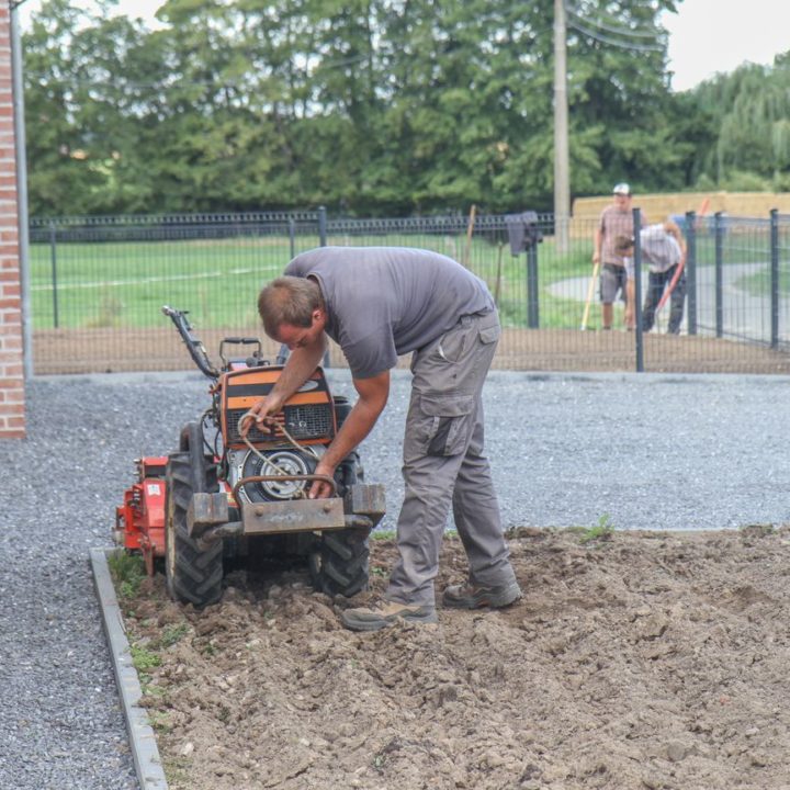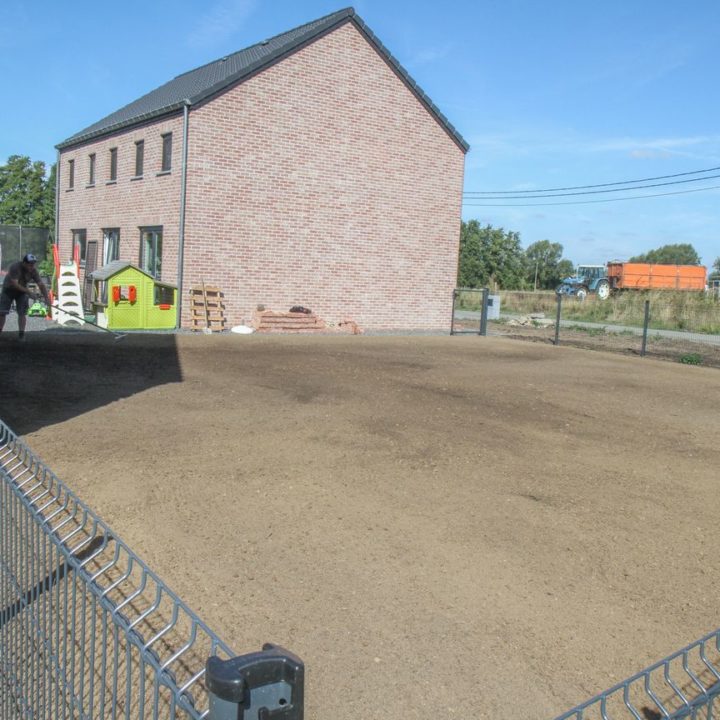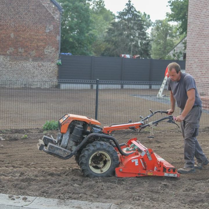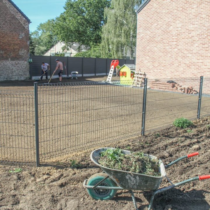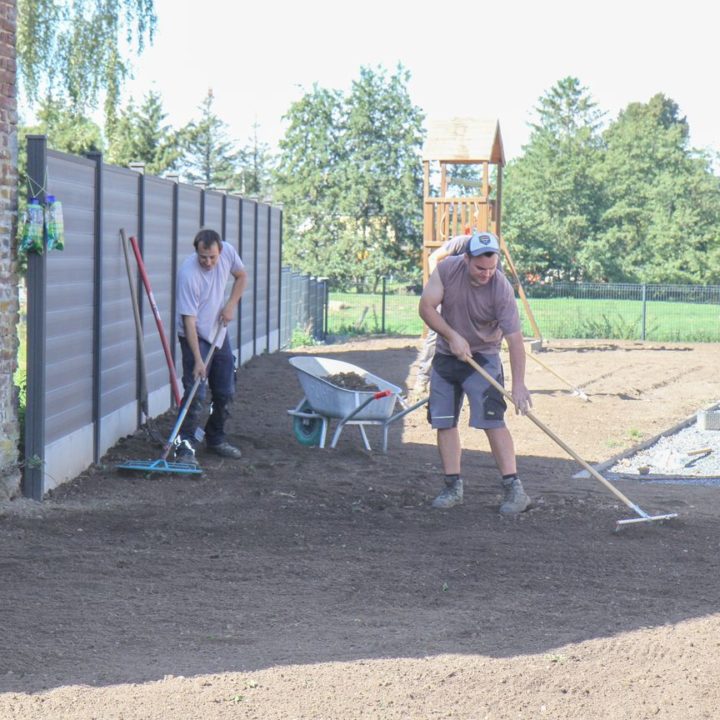 Après avoir posé la clôture rigide et une palissade brise-vue, nous réalisons le semis de la pelouse, après préparation du sol, autour de cette nouvelle construction.