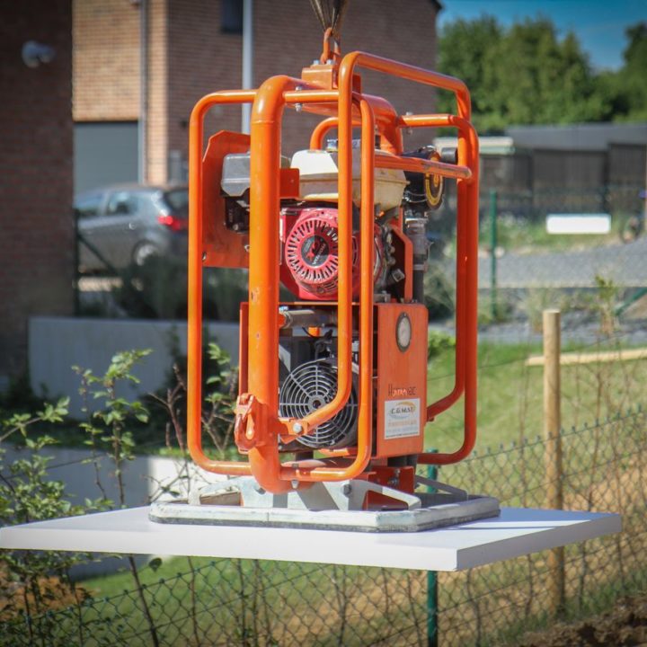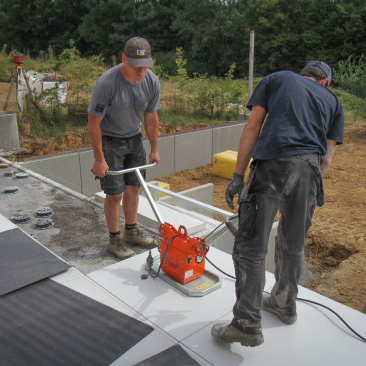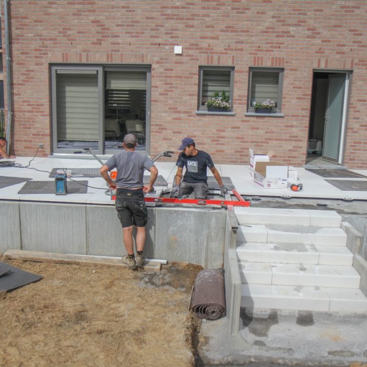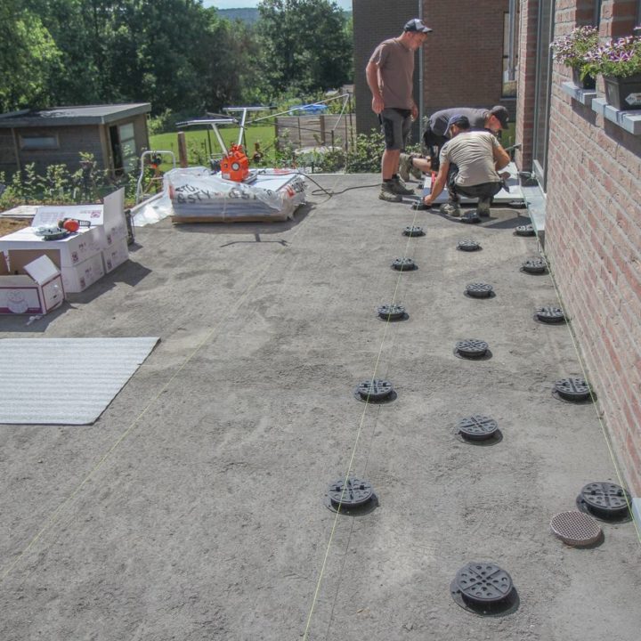 Pose de dalles 1×1 m sur plots , et d’un escalier d’accès.
