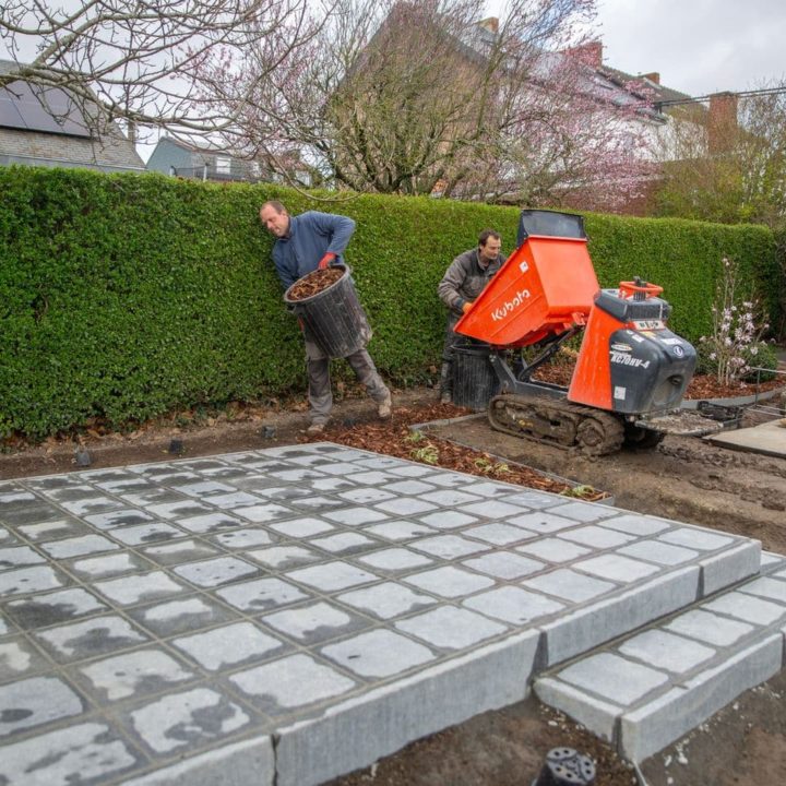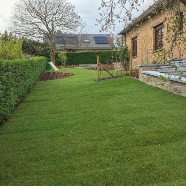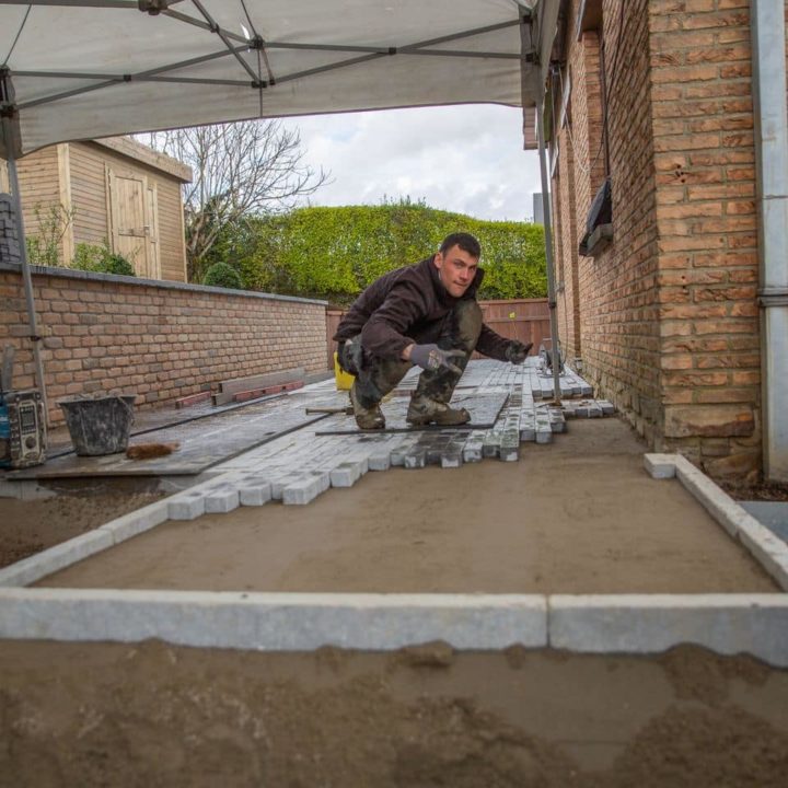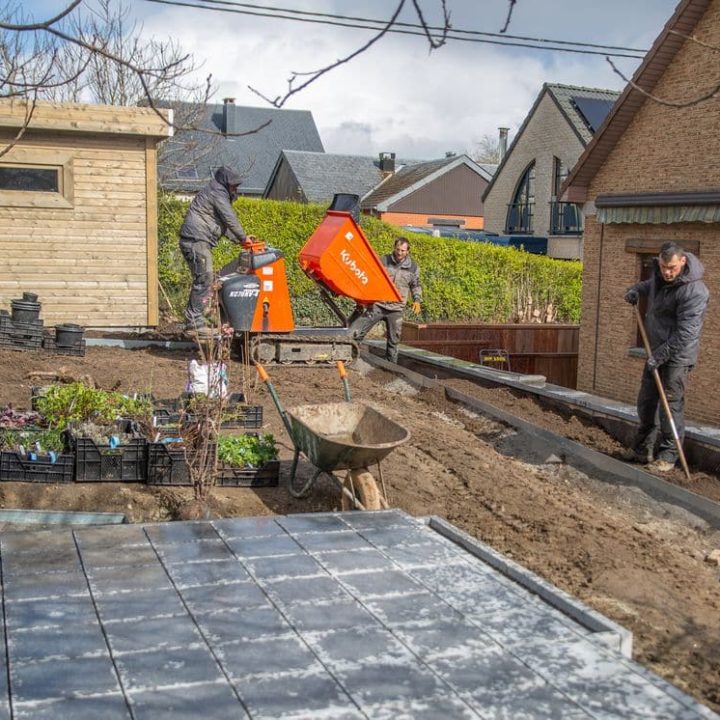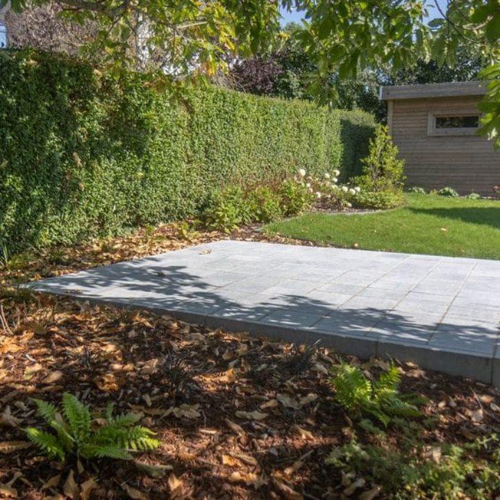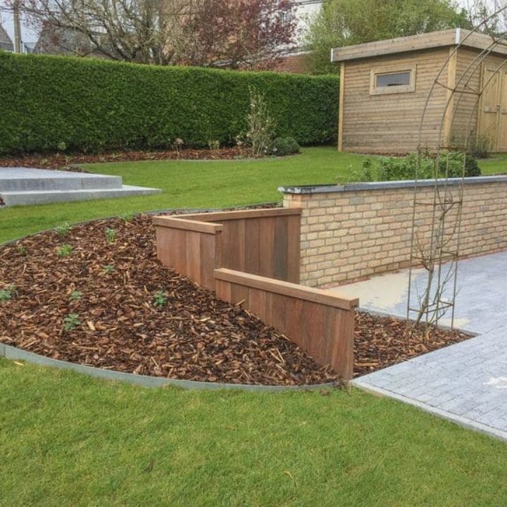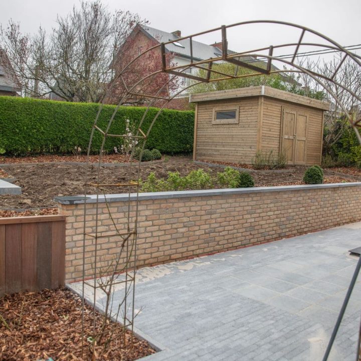 Création de terrasses, dans un jardin en pente . Pavages en pierre bleue du Hainaut . Constructions de murs de soutènement ( palplanches en bois et en briques) . Réalisation d’égouttages, Placement d’un abri de jardin. Aménagement de parterres et plantations.