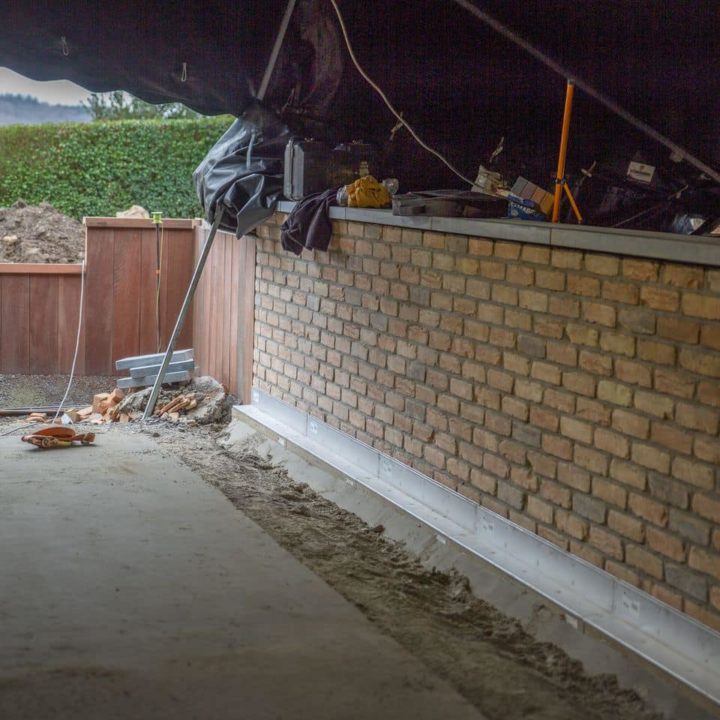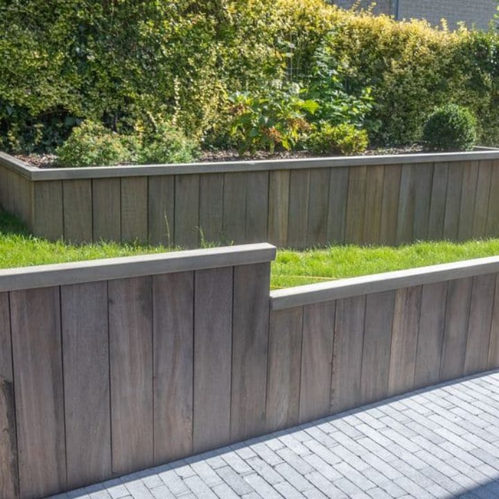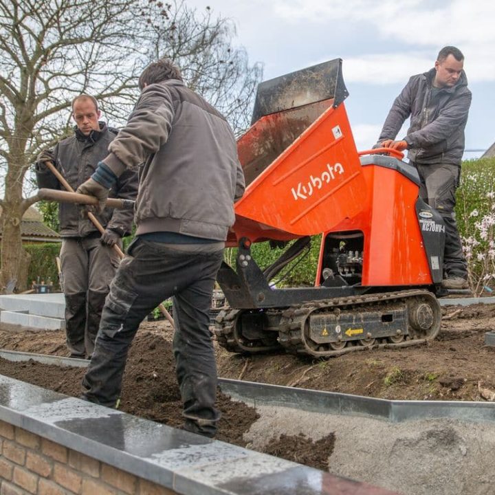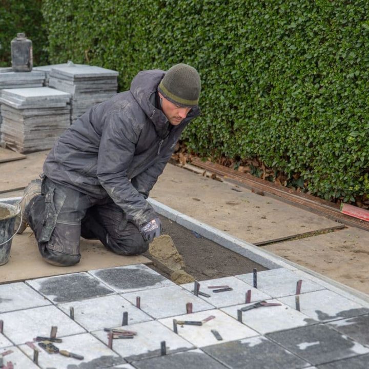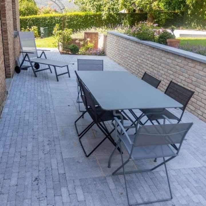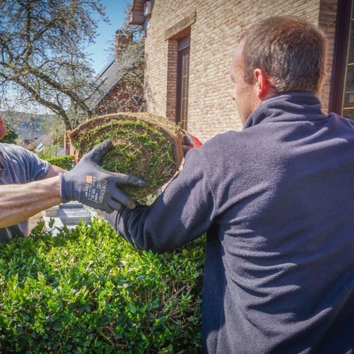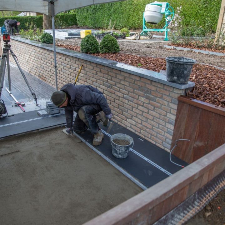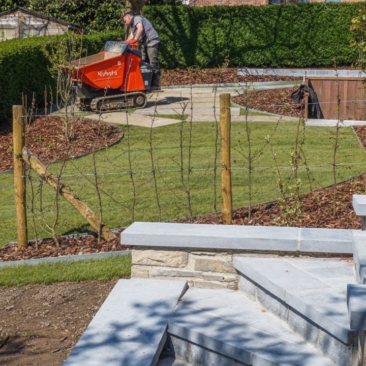 Création de terrasses, dans un jardin en pente . Pavages en pierre bleue du Hainaut . Constructions de murs de soutènement ( palplanches en bois et en briques) . Réalisation d’égouttages, Placement d’un abri de jardin. Aménagement de parterres et plantations.
