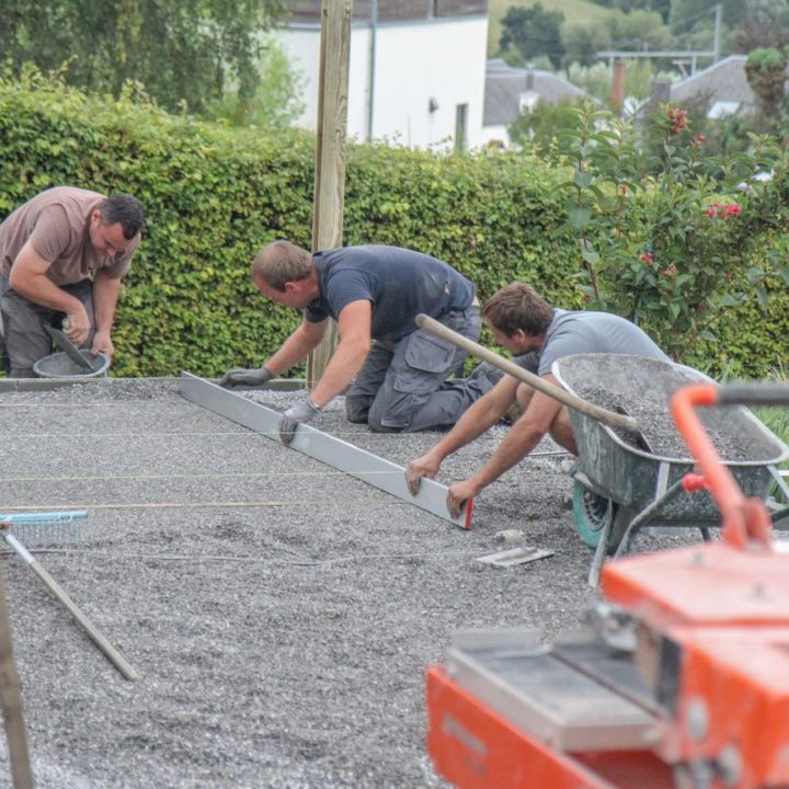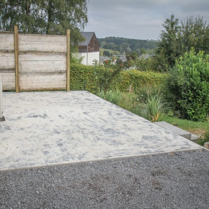 Rénovation d’une terrasse dans un immeuble à appartements. L’ancienne terrasse composée de panneaux de coffrage recyclés, était trop glissante ! Nous y avons posé des klinkers en béton, et réutilisé les panneaux de coffrage pour faire un brise vue. Une solution économique.